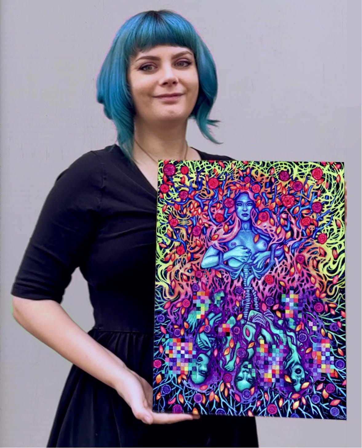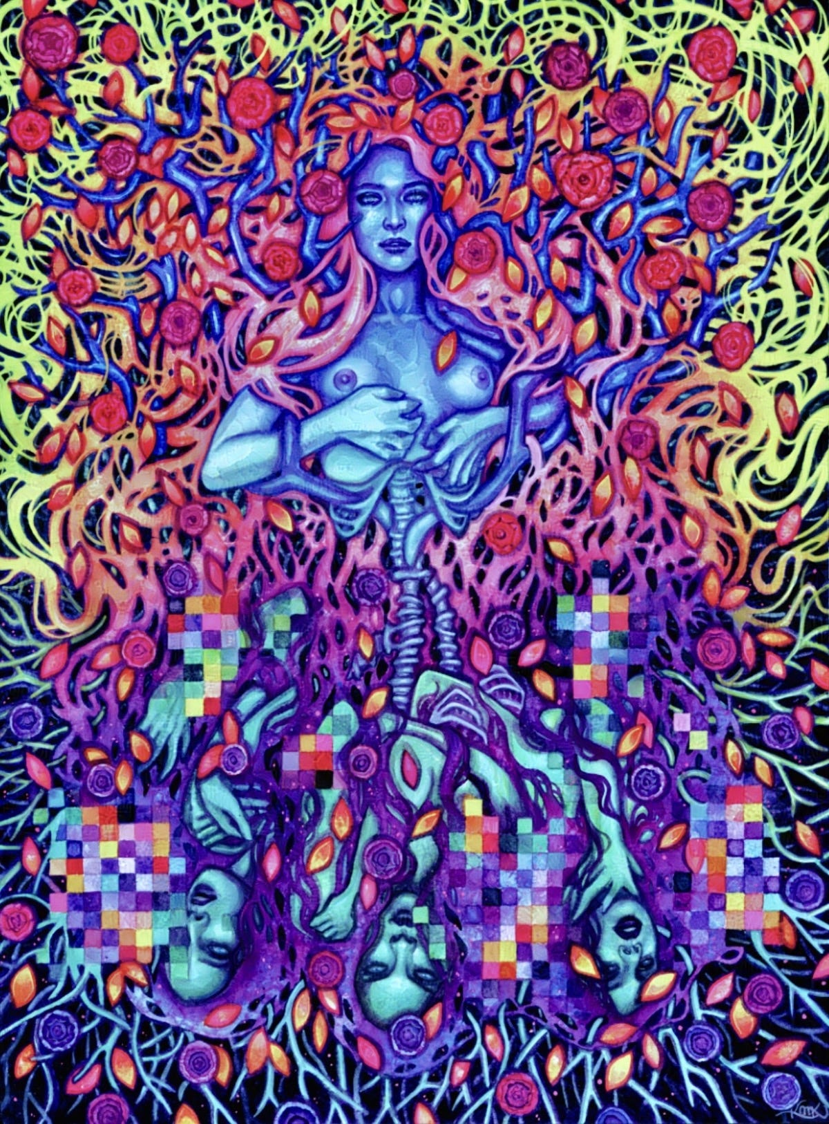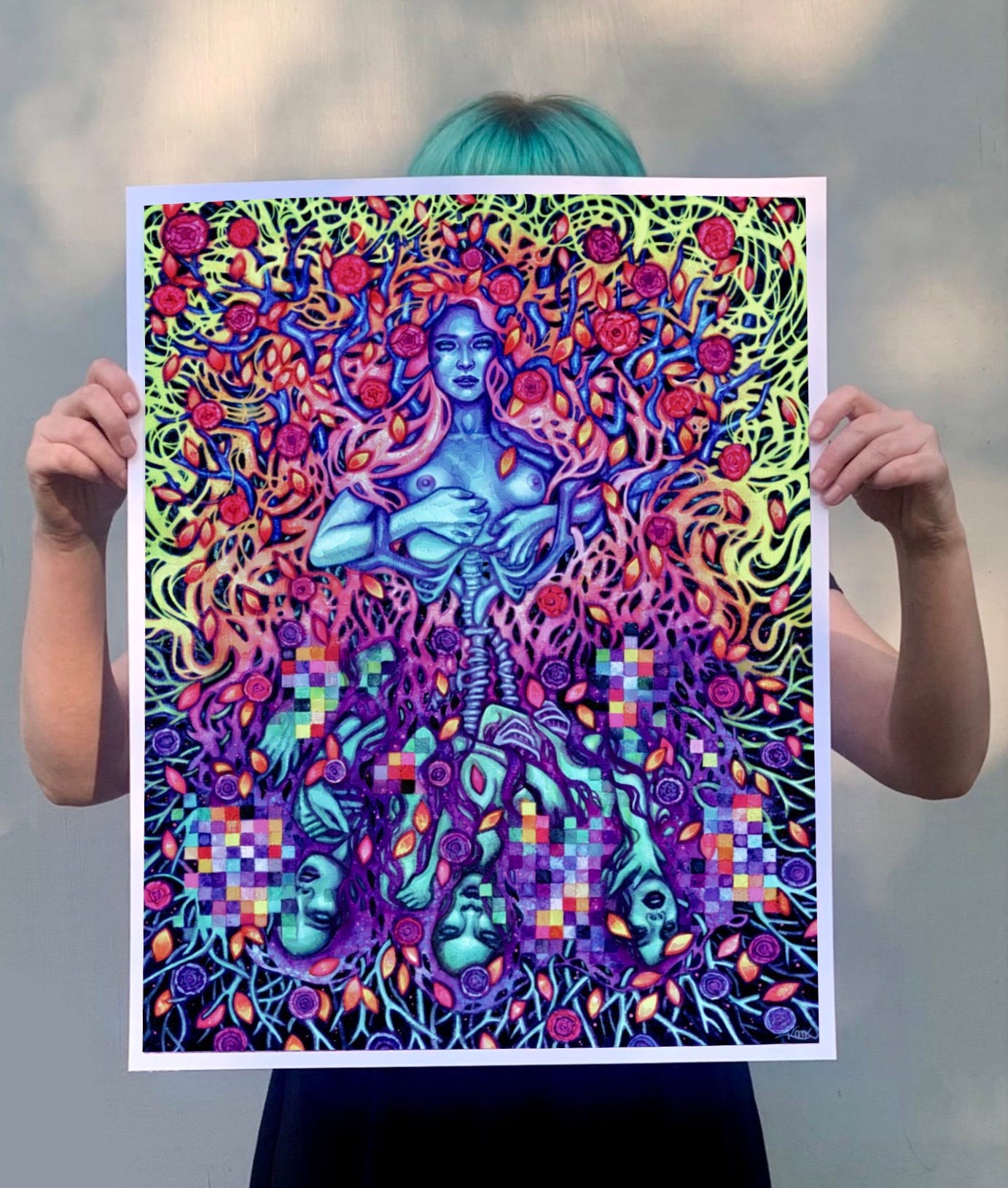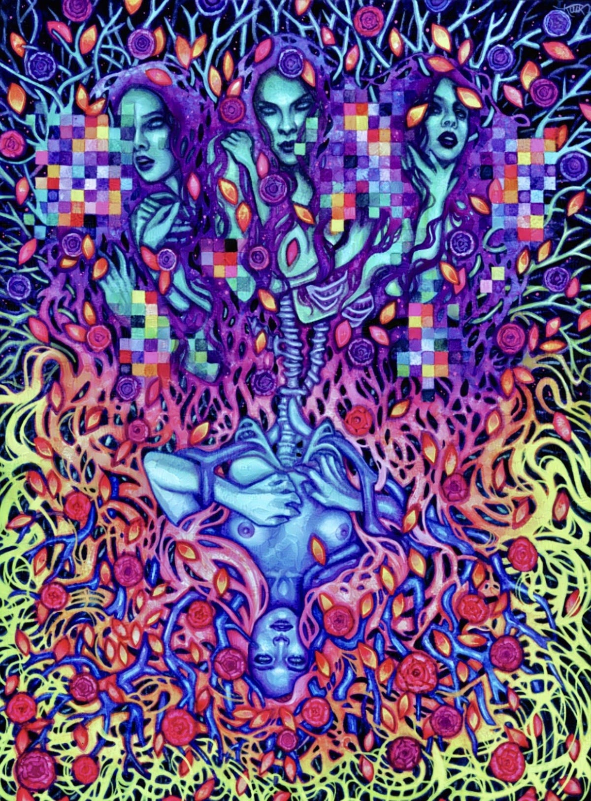 The GAI figure is monstrous, deformed with extra fingers and limbs. It forms from the mutated spine of the human figure, multiplying into three forms. They’re seductive but blank and devoid of intention. In referencing both my older work and the digital nature of GAI, parts of the painting are pixelated, a style that appeared in my own art between 2009-2012 or so. The blooms and leaves are artificial, and the hair and roots often blend into non-sensical tangles. These bits of evidence of generative AI are called artifacts.