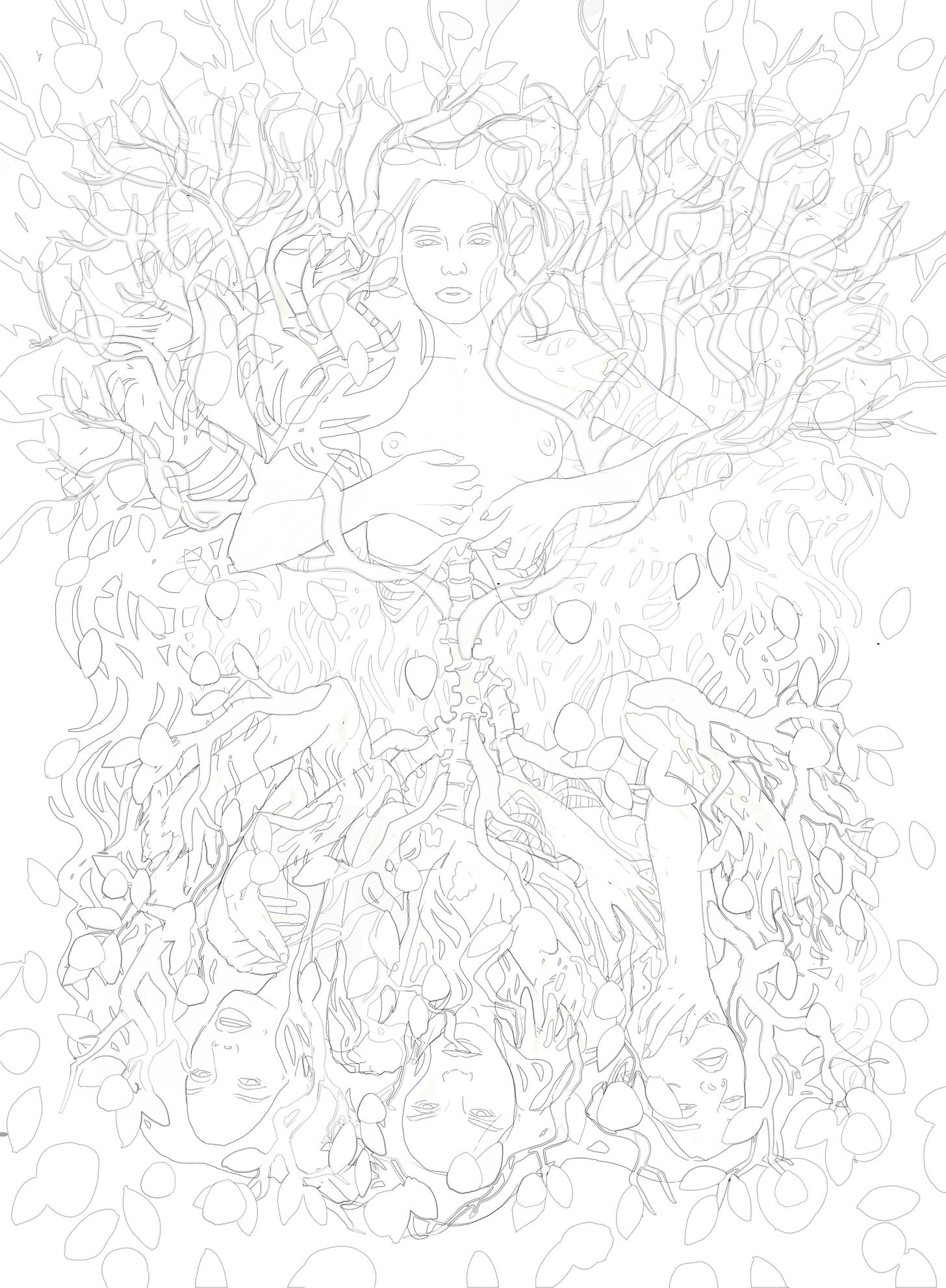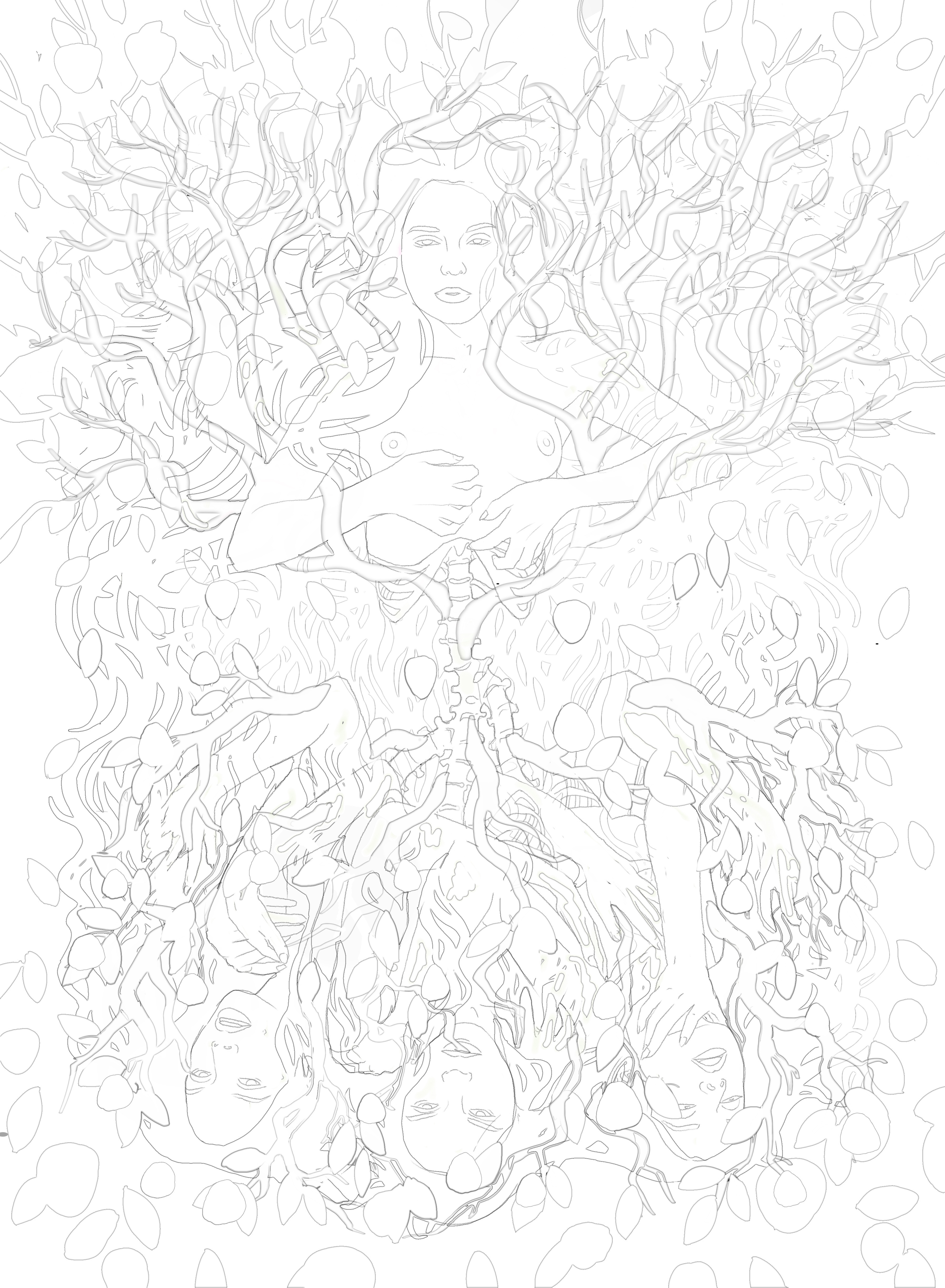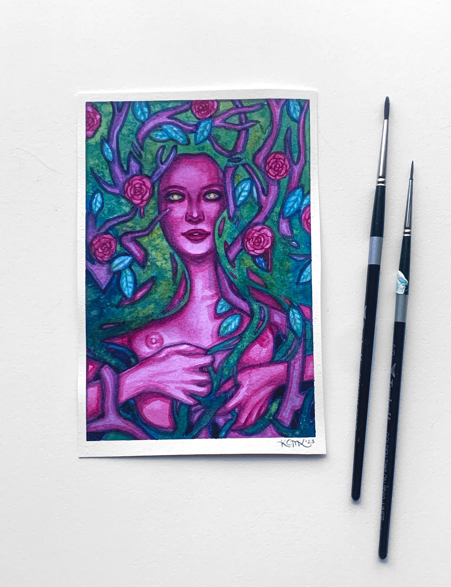 The human figure is vulnerable, bare-chested, literally tearing from her own flesh in order to create. The artist is compelled, and they’re surrounded by growth, vibrant color, and blooms. She’s an entire ecosystem that is self-sustaining.